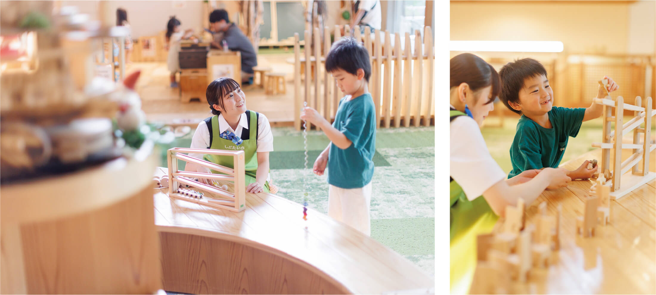 当館スタッフが常駐し、お子様と一緒に遊んだり、遊び方のアドバイスを行います。木のおもちゃは自由な発想で楽しめますので、遊び方に迷った際はお気軽にお声掛けください。