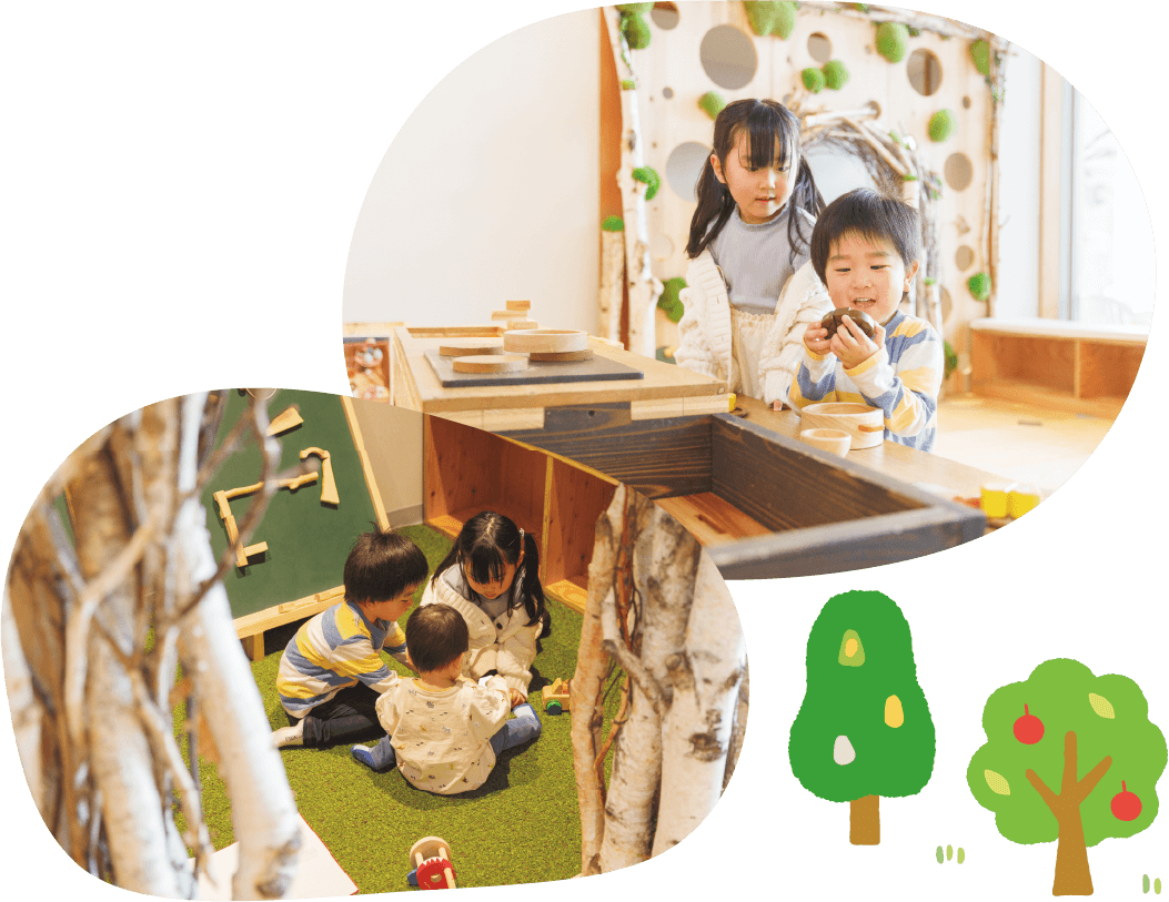 「あそびの森」がございます。キッチンでごっこ遊びをしたり、絵本を読んだり、遊び方は様々。